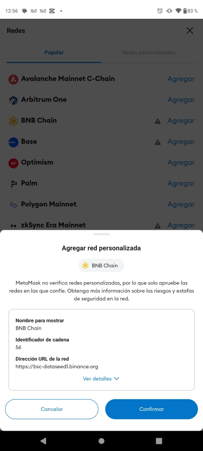 Una vez escogida BNB Chain le oprimes el boton de confirmar